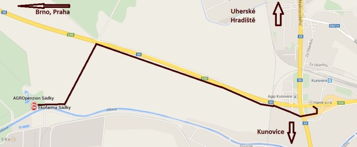 Do Kunovic dorazíte po necelých 60 km, resp. asi za 45 minut. Zbytek cesty je znázorněn na přiložené mapce. Po výjezdu z hlavní silnice dorazíte na světelně řízenou křižovatku, kterou projedete rovně. Minete Hypermarket Albert hned za křižovatkou a pojedete po menší zpevněné cestě, která vede podél hlavního tahu (E50). Po několika stech (až cesta dál nebude pokračovat) metrech odbočte vlevo. Dalších cca 700m pojedete po polní cestě. Poté odobočte vpravo a přijedete k penzionu.
